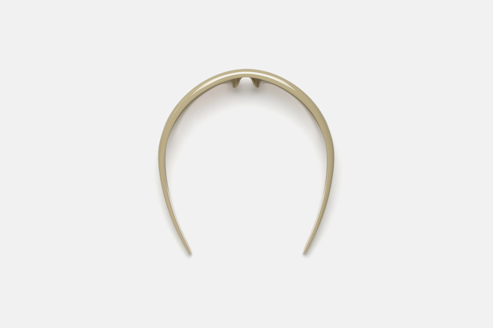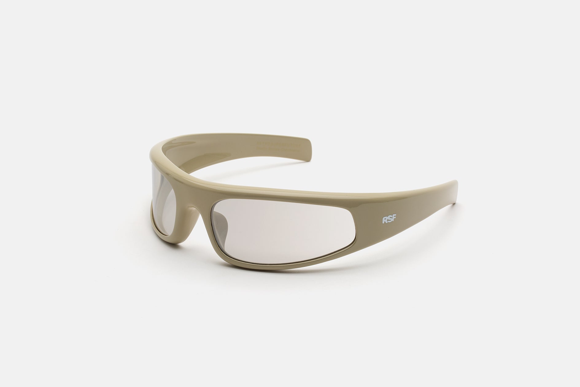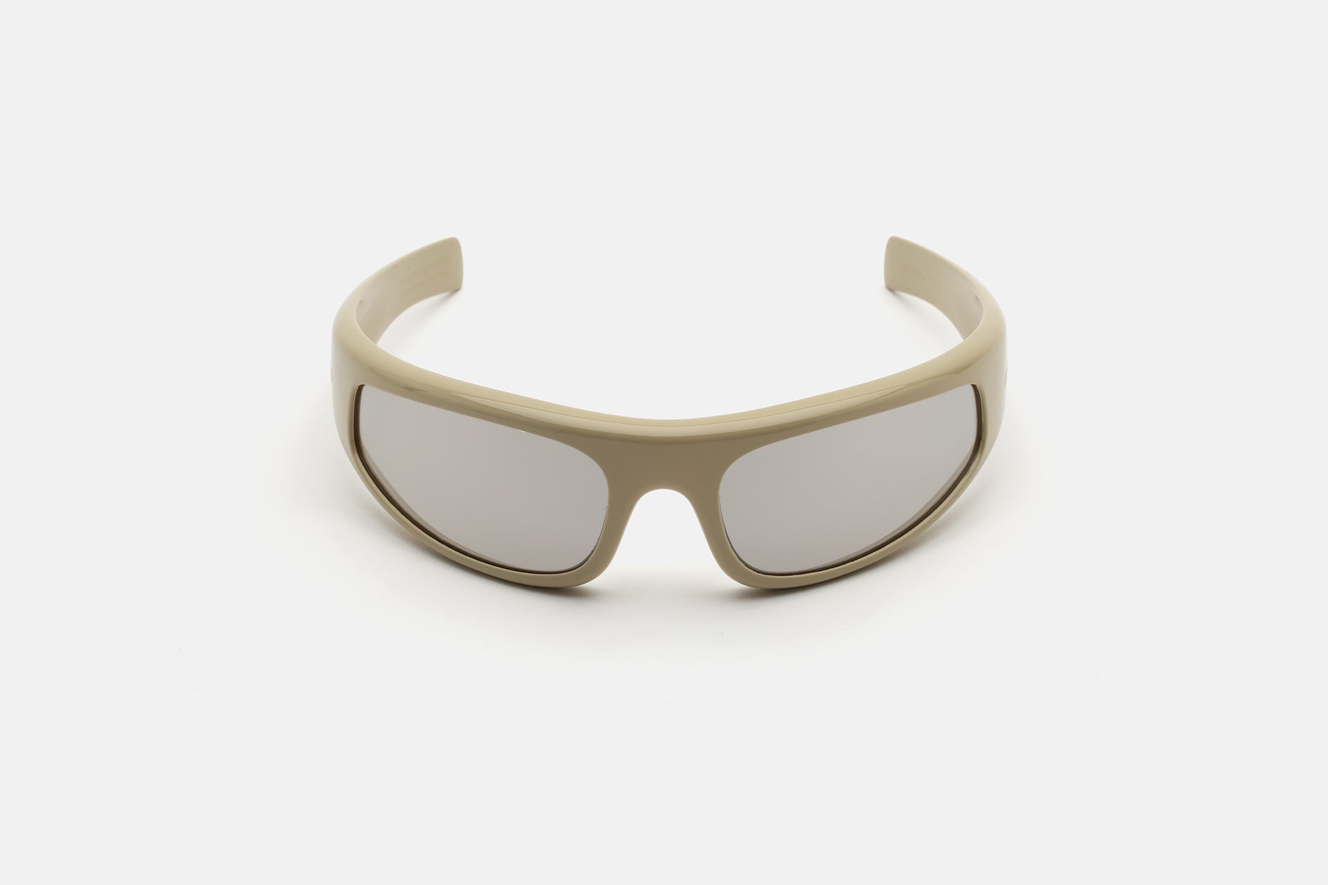 Custom made semicircle, lightweight and hingeless buttery off-white nylon frame. Mounting wrap around lenses in a warm smokey grey. Premium eyewear designed in Milano, Italy.