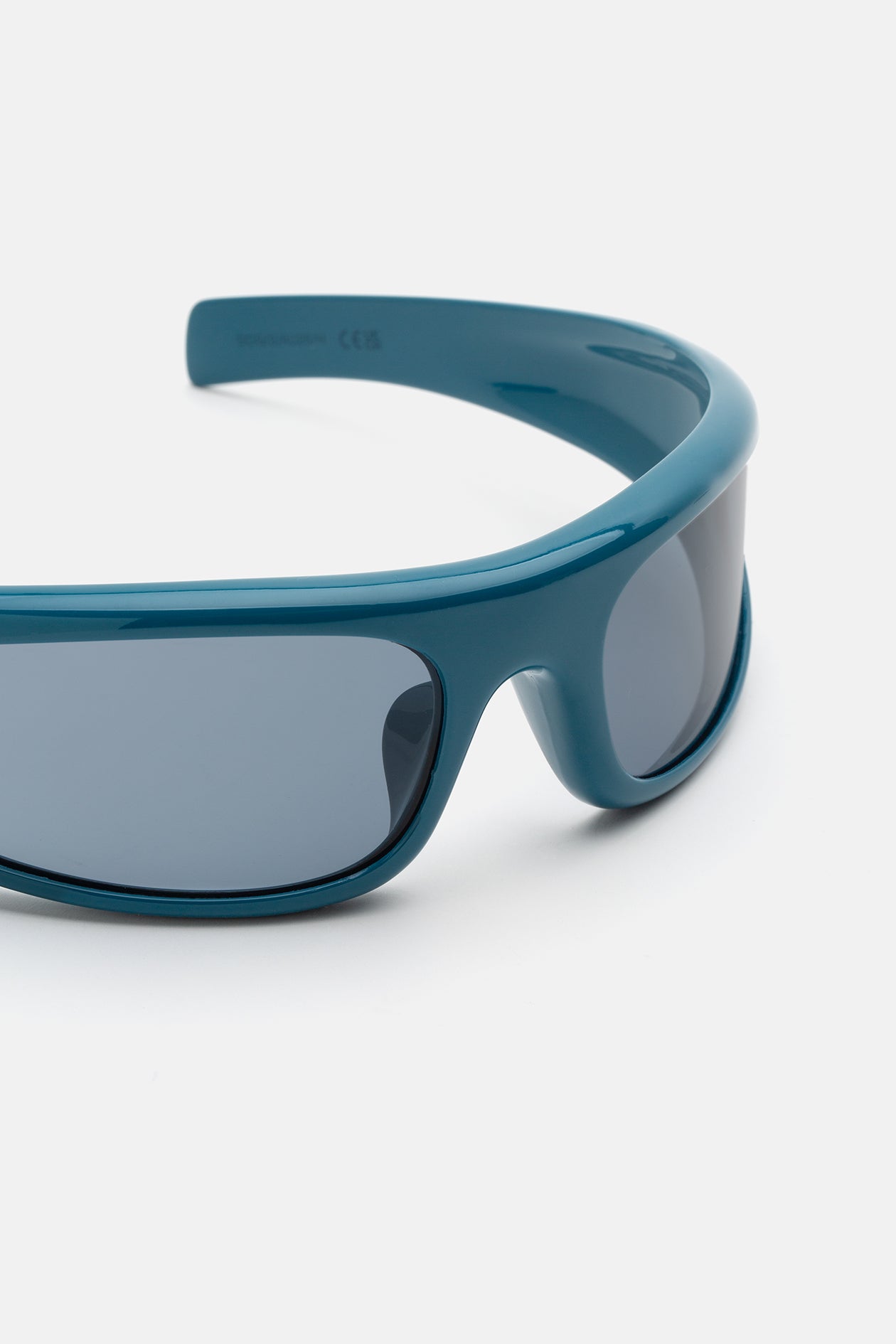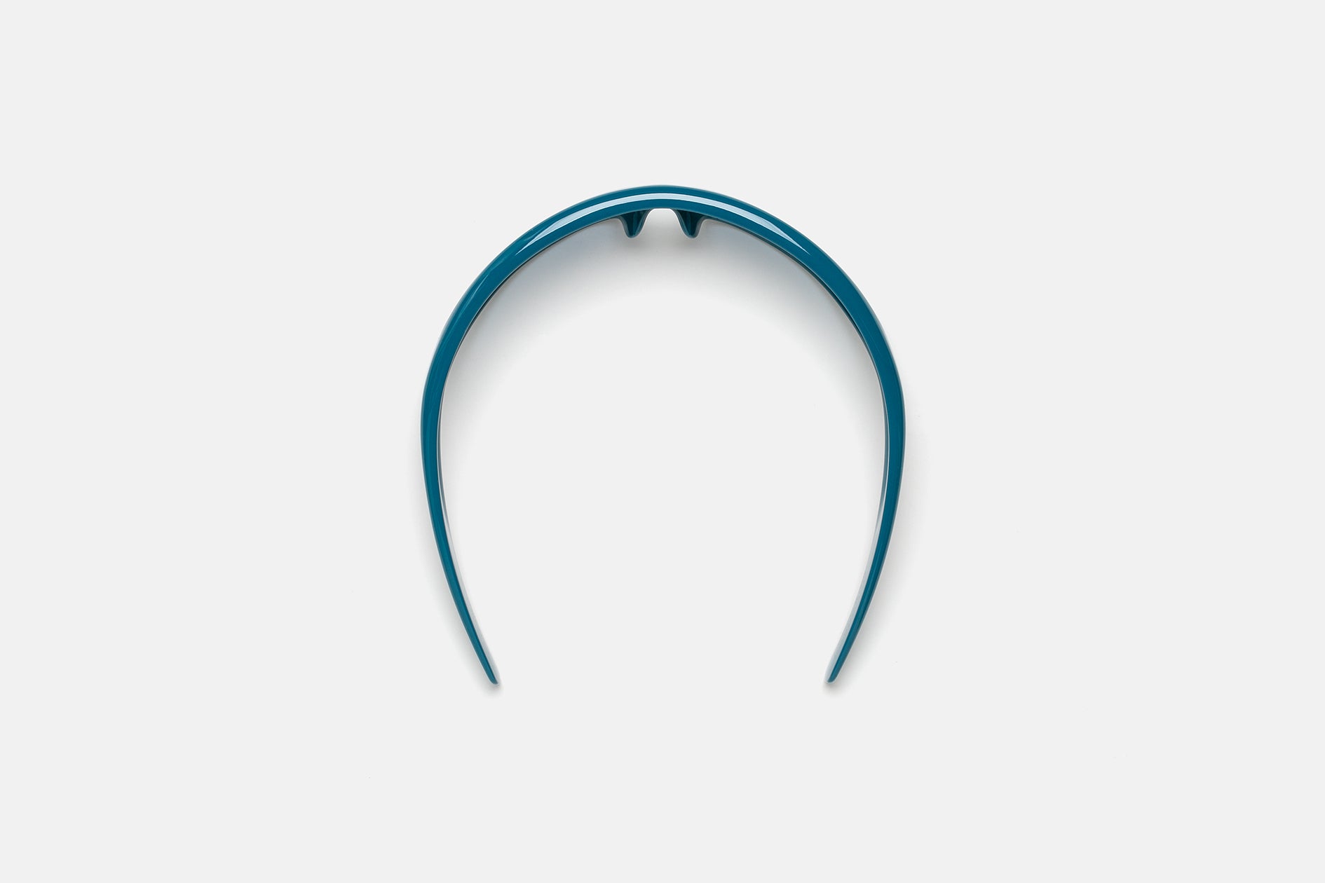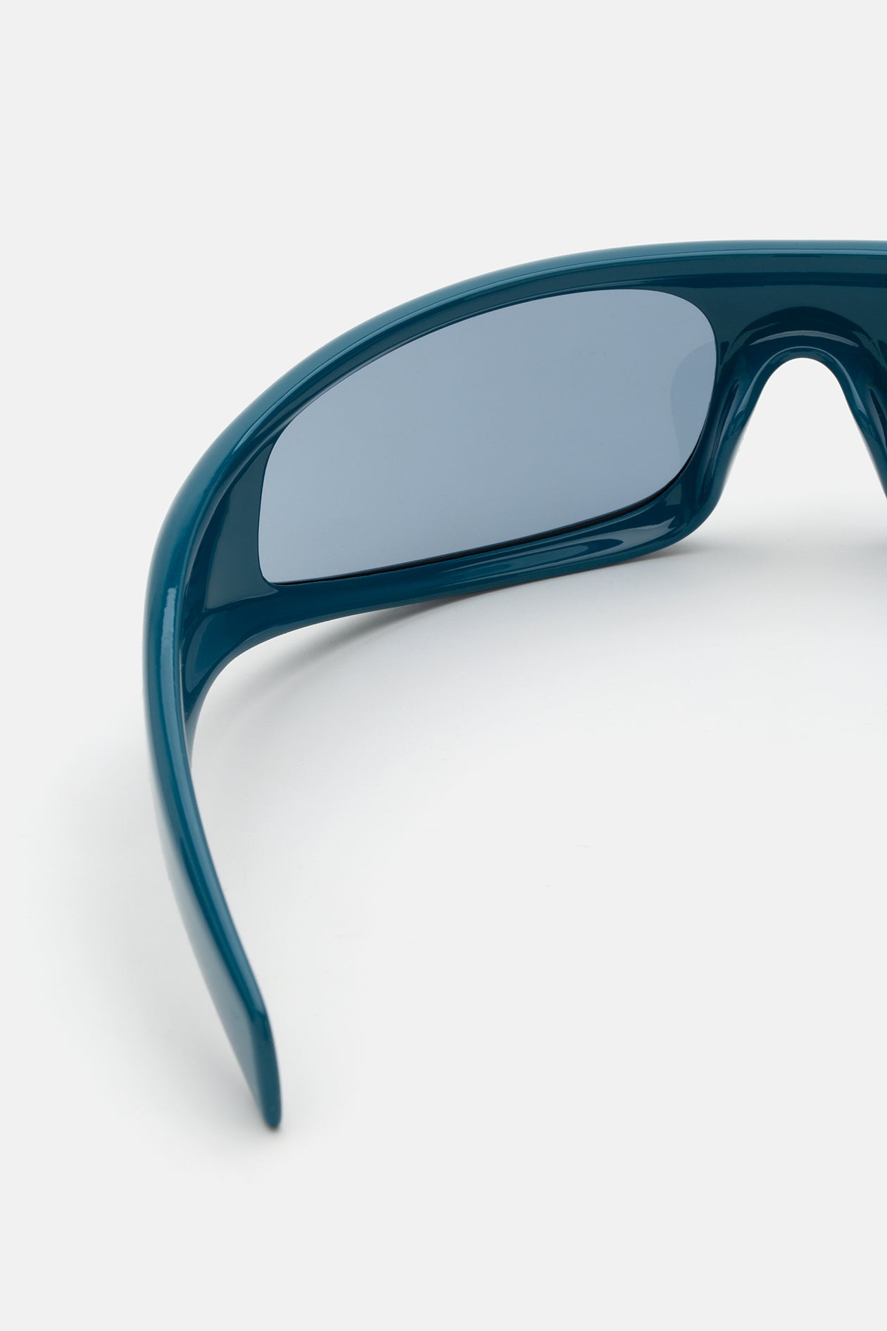 Custom made semicircle, lightweight and hingeless cerulean blue nylon frame. Mounting tone-on-tone wrap around lenses in blue. Premium eyewear designed in Milano, Italy.