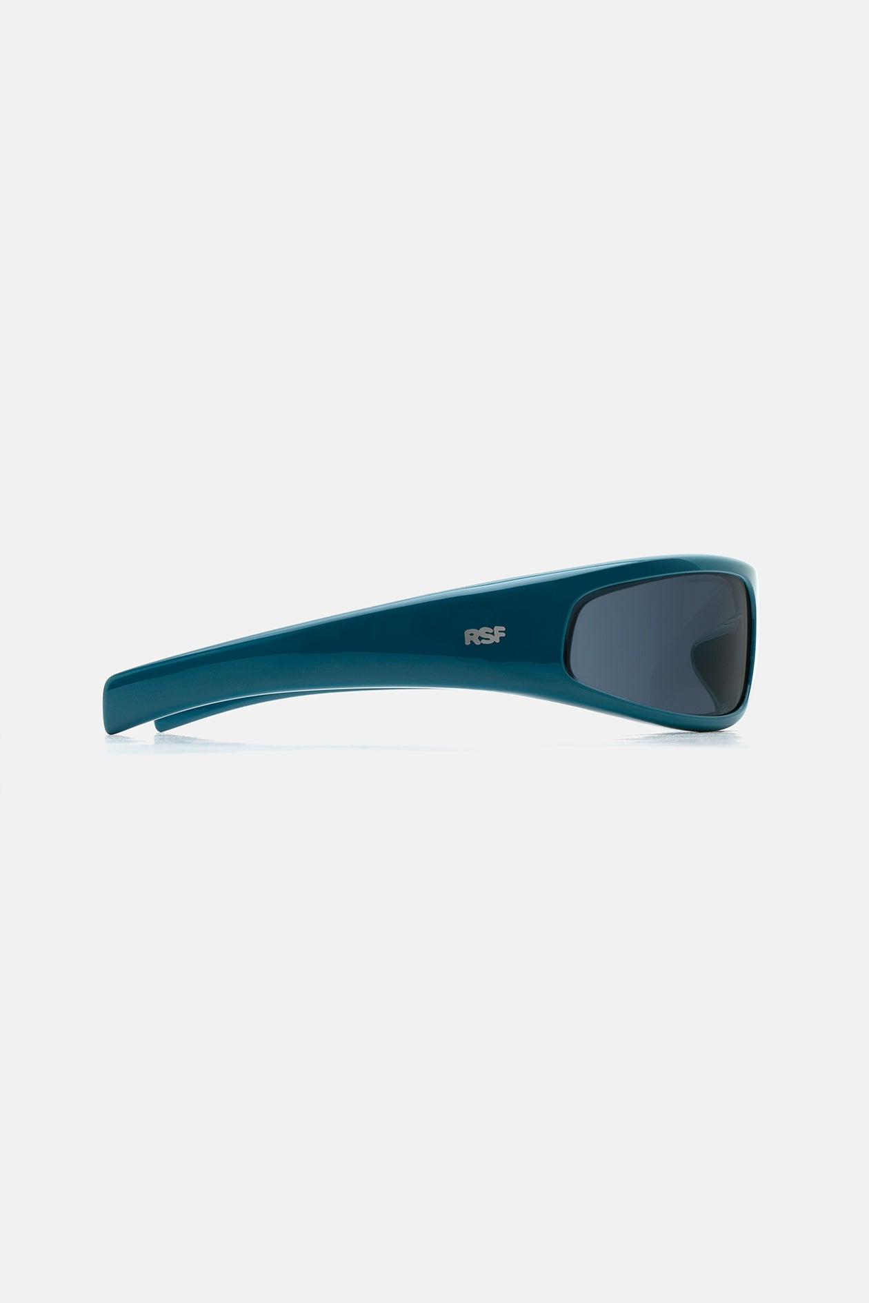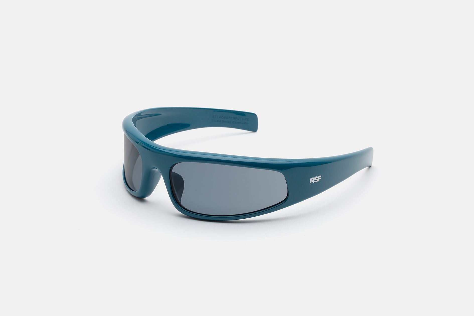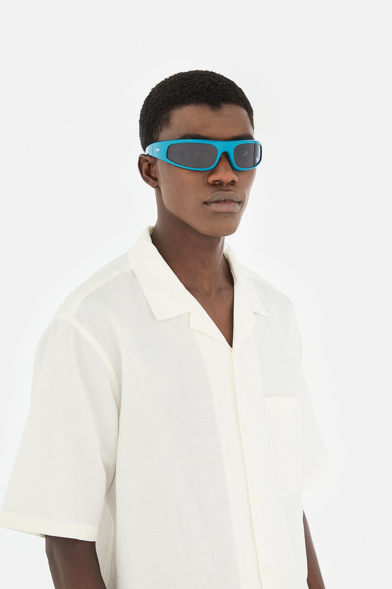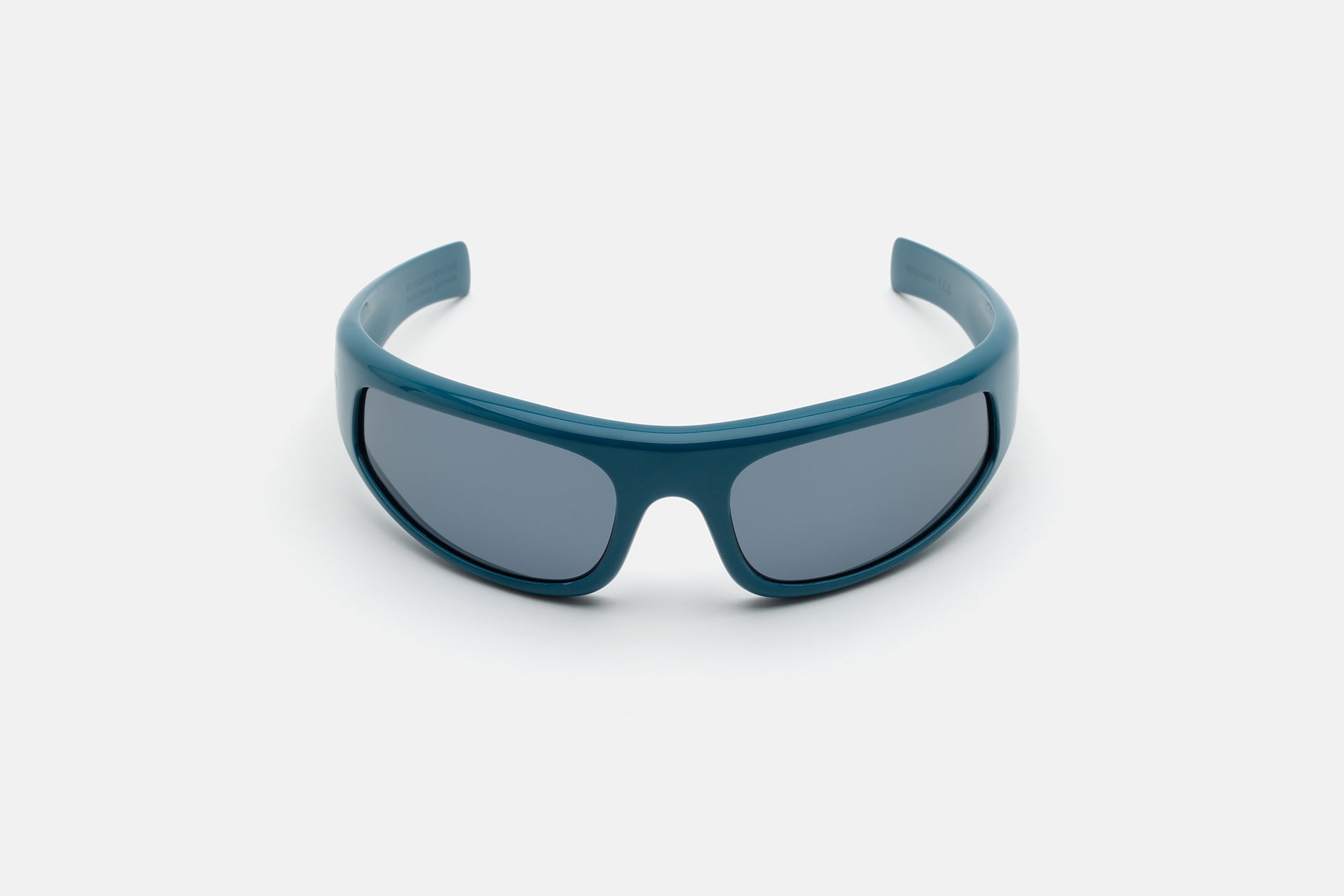 Custom made semicircle, lightweight and hingeless cerulean blue nylon frame. Mounting tone-on-tone wrap around lenses in blue. Premium eyewear designed in Milano, Italy.