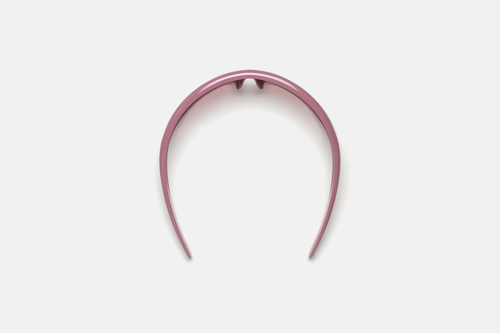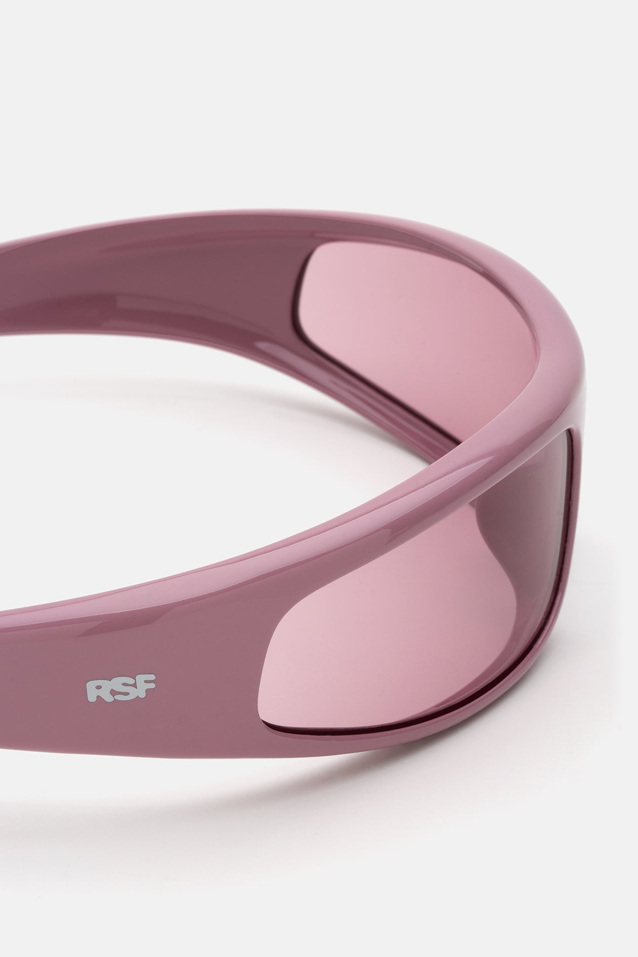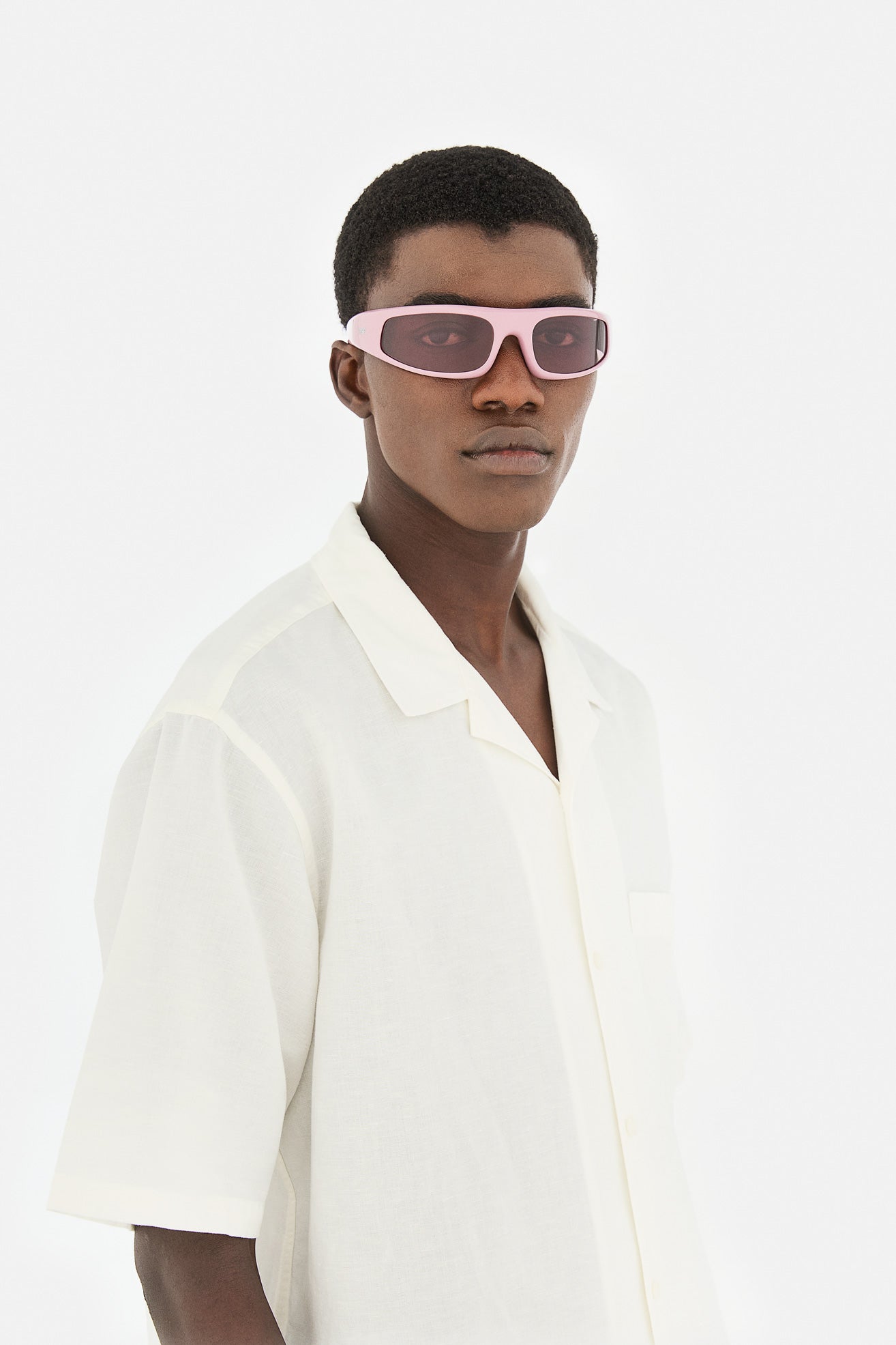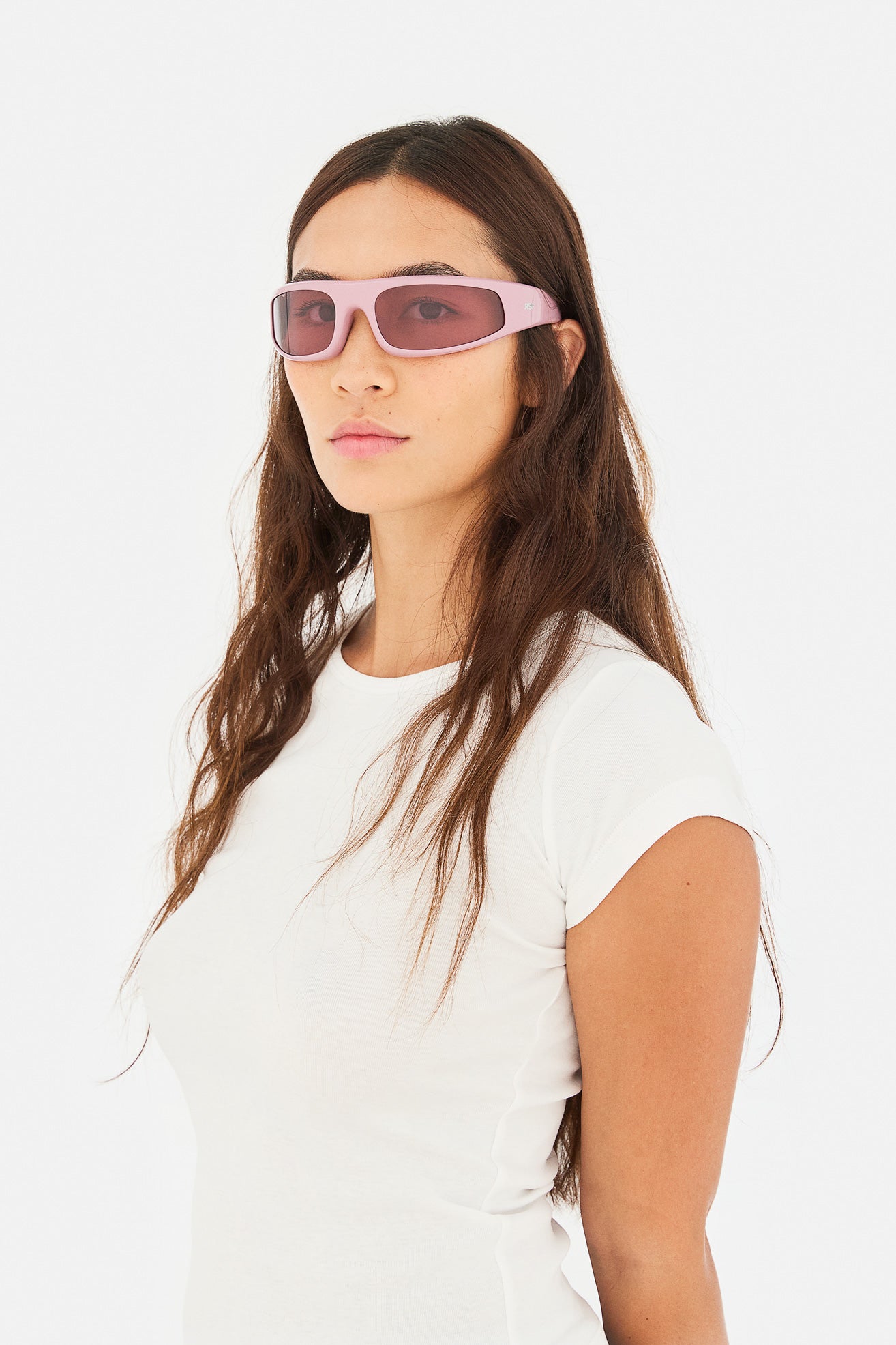 Custom made semicircle, lightweight and hingeless powder pink nylon frame. Mounting tone-on-tone wrap around lenses in pink. Premium eyewear designed in Milano, Italy.