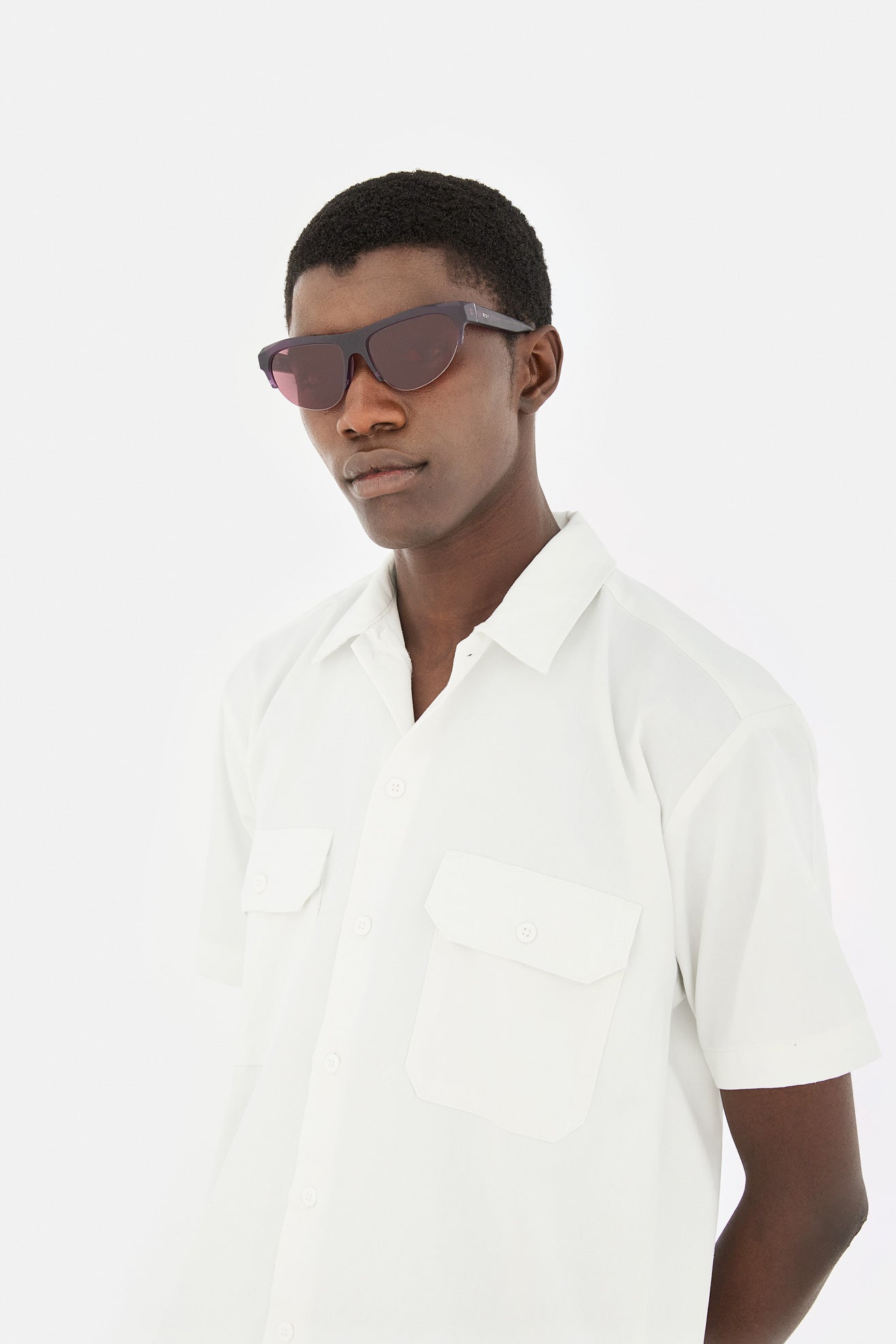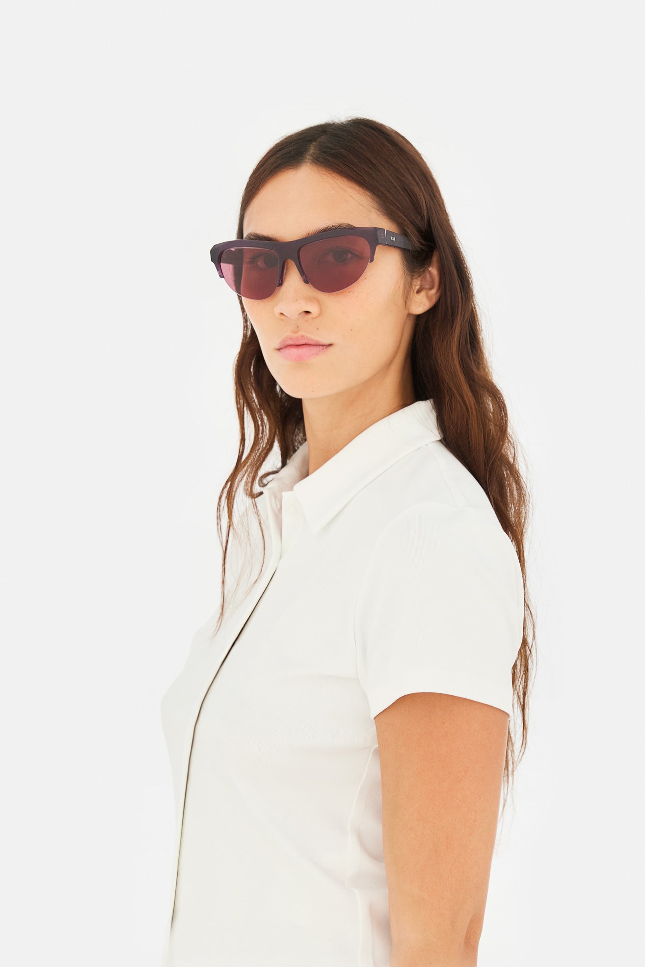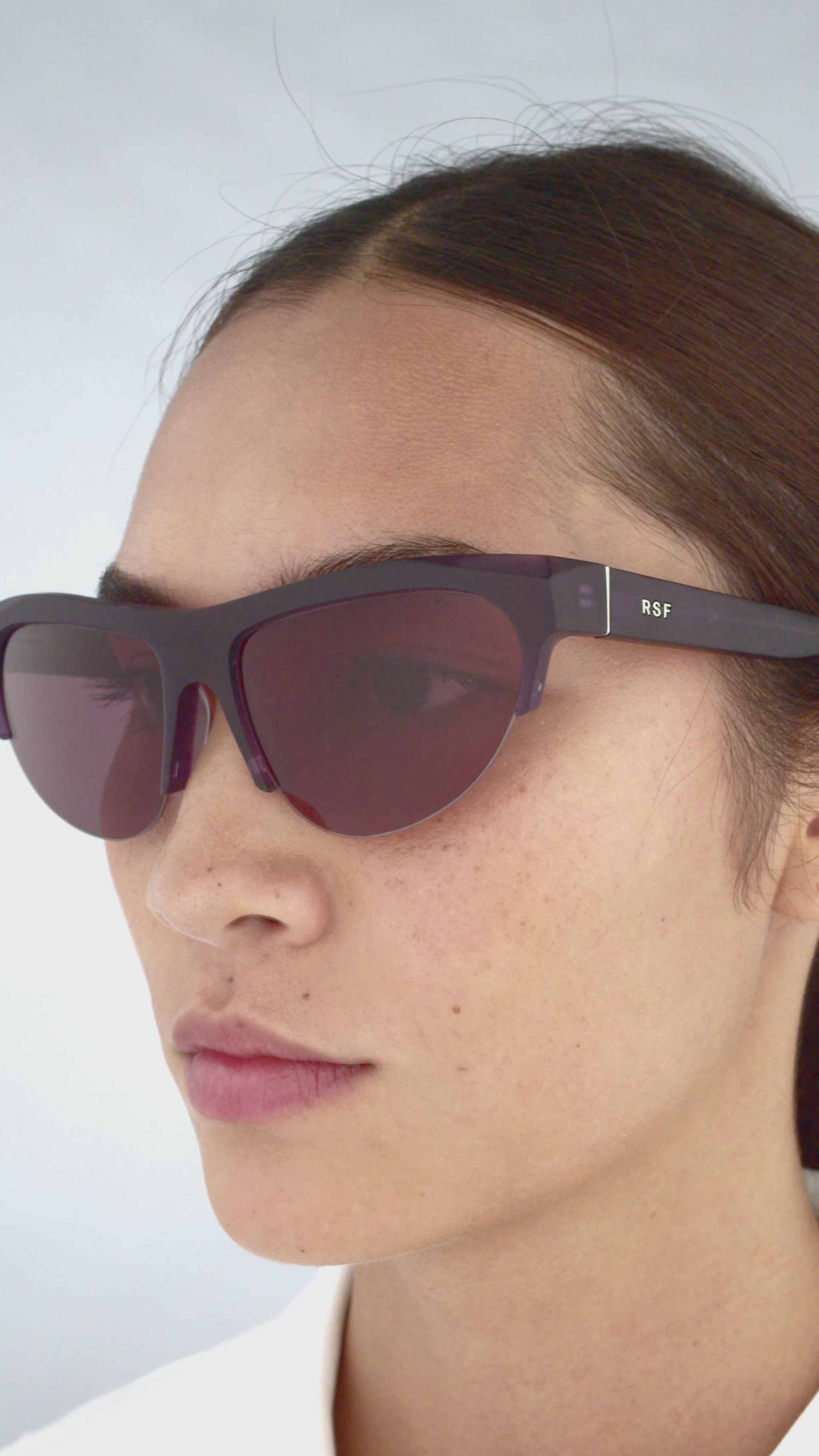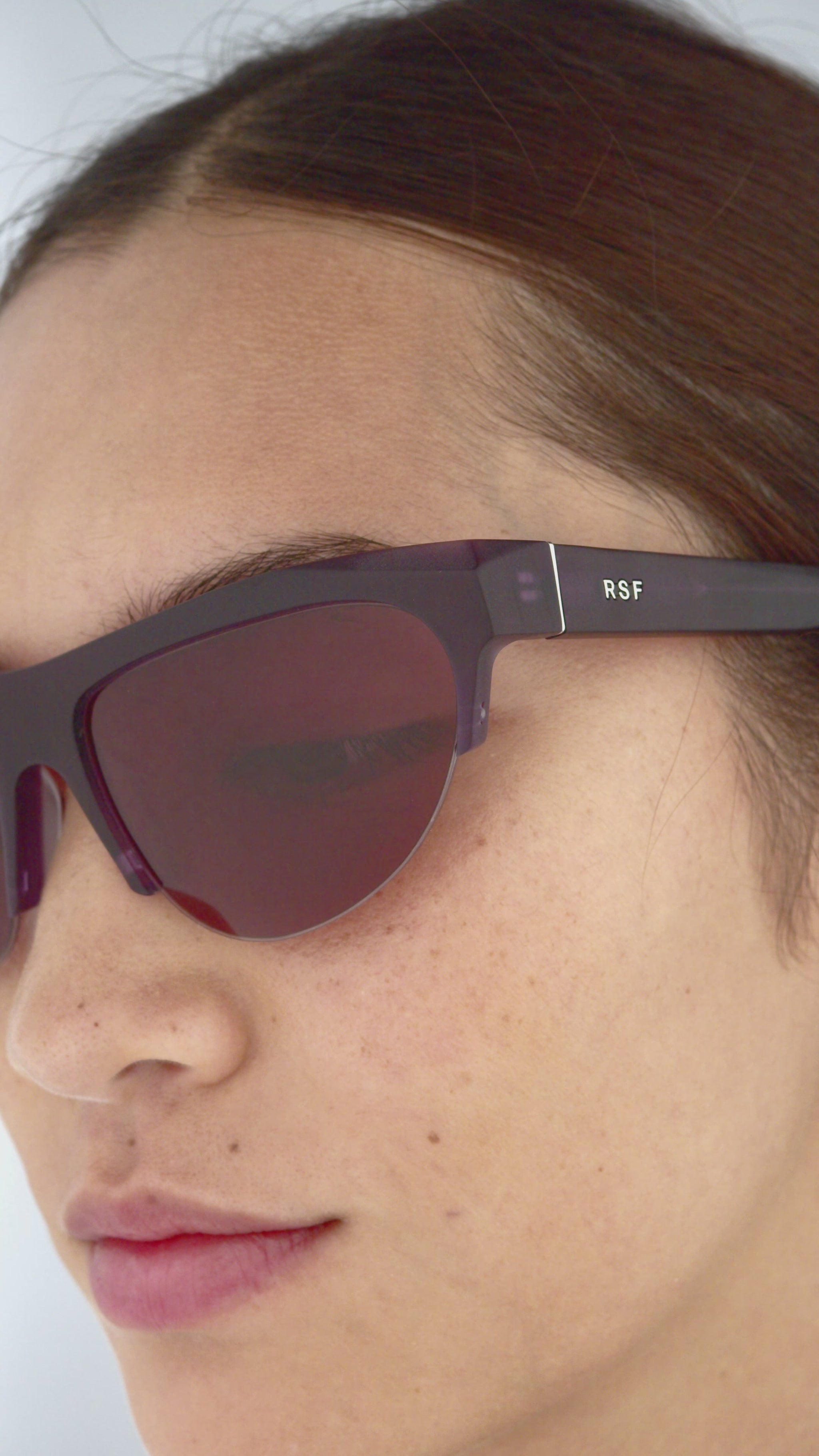 High grade acetate in a unique aubergine purple acetate. Mounting elegant aubergine lenses by Zeiss in base 6. Premium eyewear designed in Milano, Italy.